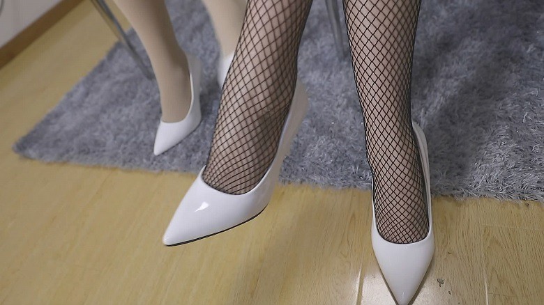 标准的三人ol白色制服 白色高跟鞋 丝袜以及黑色打底衫和白色裙子装。