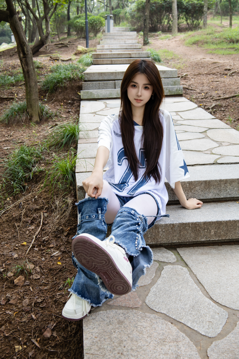 足愉心摄影第73期:模特小瑶(搭配:白色体恤、牛仔短裤、牛仔腿套、白色丝袜、白色棉袜、板鞋)