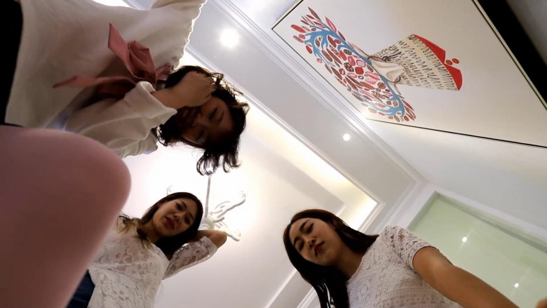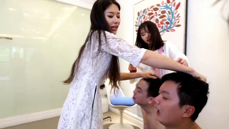 芷晴命令两个m抢着刁鞭子,也是偷偷的和另两位s说好,一人一脚把他们踢到亲在一起,太坏了!